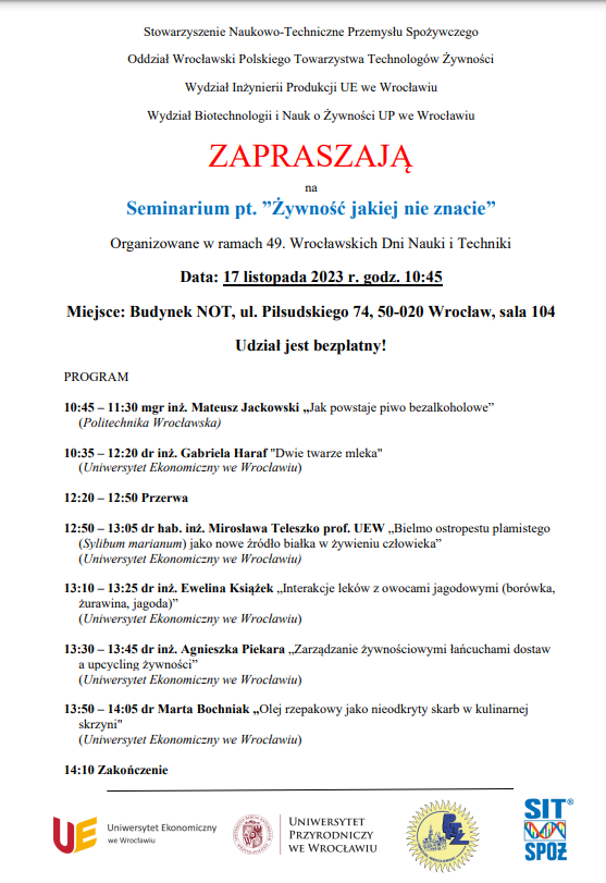 Seminarium pt. ”Co jeść a czego nie? – oto jest pytanie” organizowane w ramach XVIII Wrocławskich Dni Nauki i Techniki.10 listopada 2022 r. w budynku NOT przy ul. Piłsudskiego 74, 50-020 Wrocław więcej….